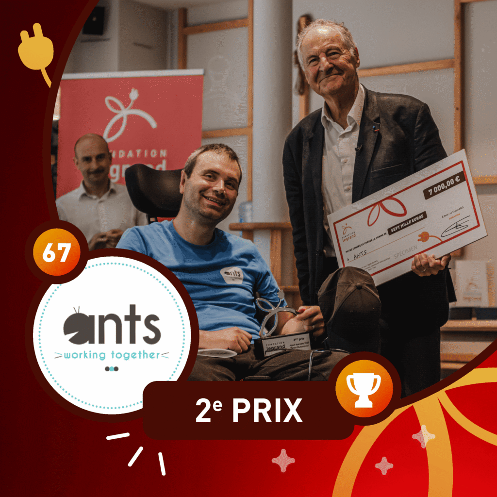 Le deuxième prix a été attribué à ANTS et remis par Alain Franco, Professeur honoraire de Médecine, Gériatrie et Gérontologie et Gérontechnologie. Le projet “Consolider et pérenniser le projet de ANTS, à travers les deux salles S.P.O.R.T. ouvertes à Lyon et Grenoble” concerne la mise à disposition de ses adhérents, des personnes atteintes d’un déficit moteur, des appareils de musculation pour le haut du corps et des vélos à stimulation électrique fonctionnelle (SEF) qui permettent de remettre en mouvement des membres paralysés (bras ou jambes).