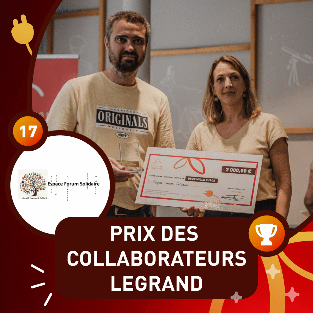 Le prix des collaborateurs Legrand, issu d’une campagne de vote auprès des collaborateurs de Legrand en France a été remis à Espace Forum Solidaire par Virginie Gatin, Directrice RSE de Legrand. Le projet concerne l’accompagnement des personnes en milieu rural rencontrant des difficultés de mobilité, notamment les jeunes et les seniors. L’objectif est de préparer une mise en relation avec des chauffeurs bénévoles pour leur permettre d’assurer leurs rendez-vous et ne pas s’isoler socialement.