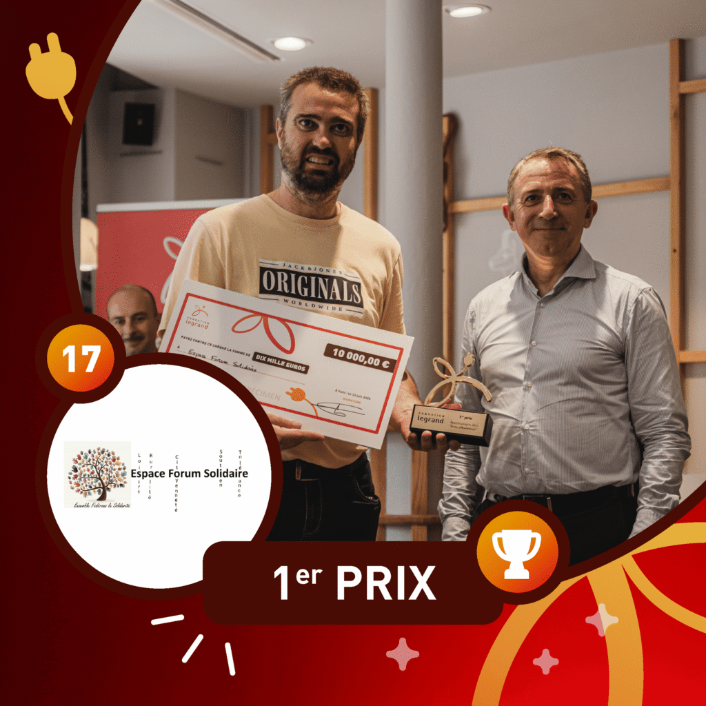 Le premier prix a été remis à Espace Forum Solidaire par Benoît Coquart, Directeur Général de Legrand et Président de la Fondation Legrand. Le projet Mise en place d’un service de Transport d’utilité Sociale Solidaire” le projet concerne l’accompagnement des personnes en milieu rural rencontrant des difficultés de mobilité, notamment les jeunes et les seniors.