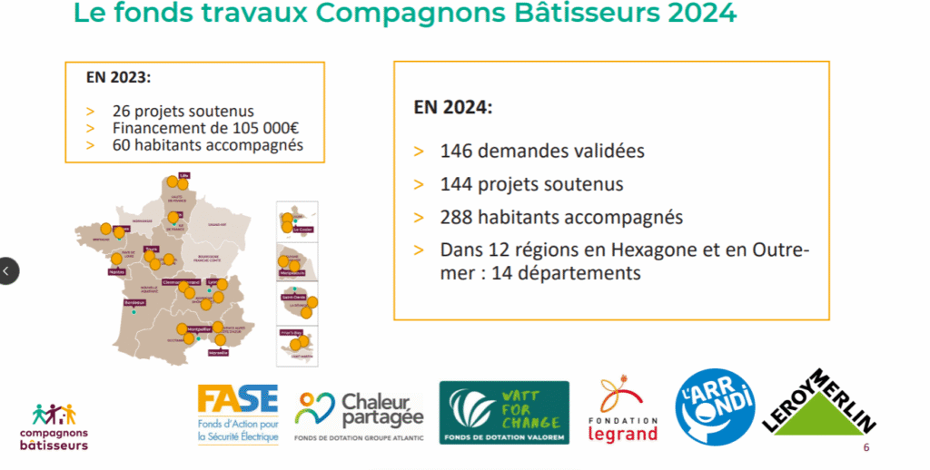 Compagnons Bâtisseurs compte 60 ans d’existence ! C’est une association qui intervient sur l’amélioration de l’habitat, le développement de réseaux d’entraide de proximité, l’insertion par l’activité économique dans le secteur du bâtiment et l’accueil de jeunes volontaires (service civique et service volontaire européen) et de bénévoles. Ce qui est relatif aux objectifs de la fondation Legrand car elle vise à développer les conditions de vies des personnes en situation de précarité.